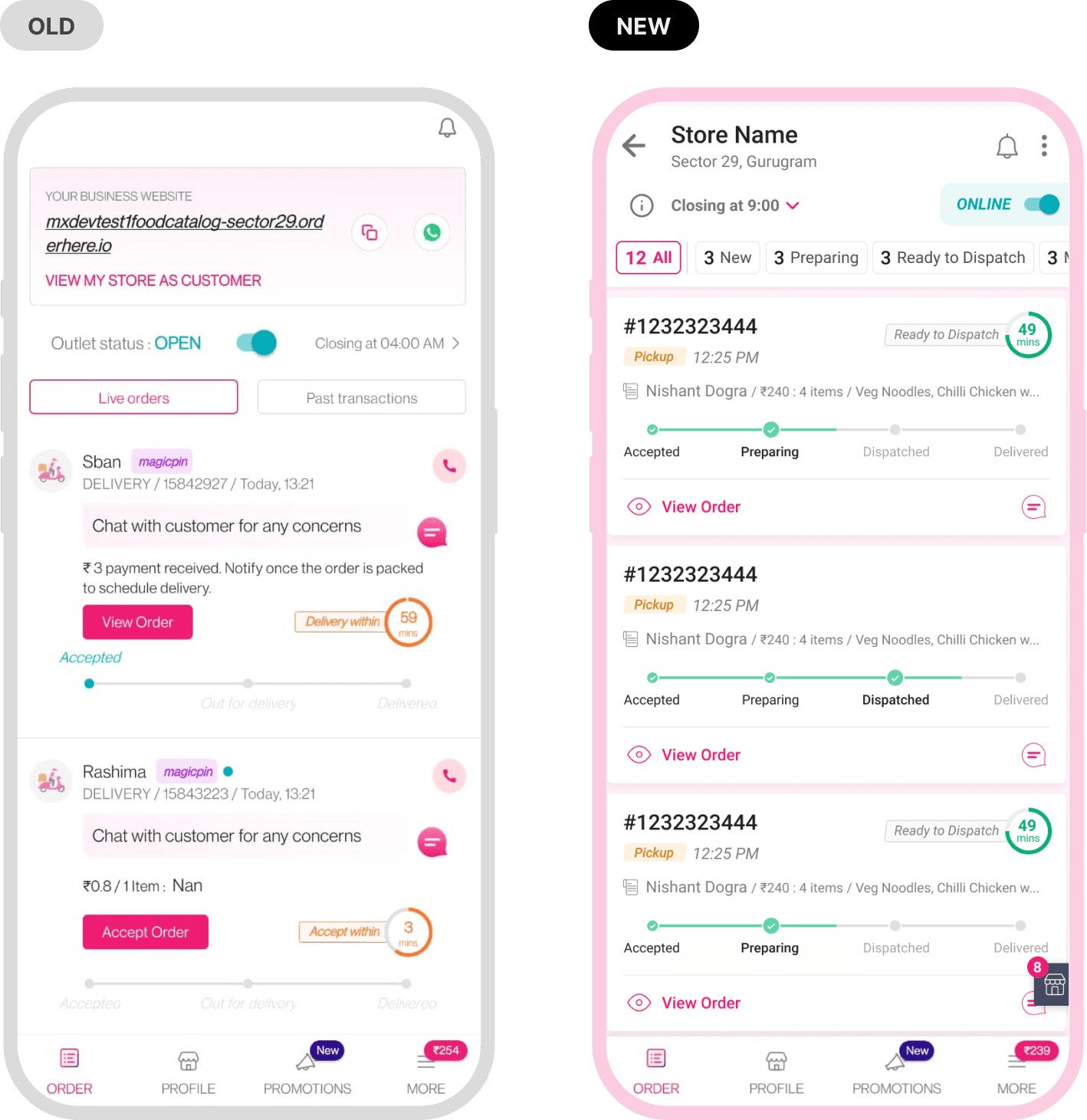 Reason for the colors, Delivery was the most important one hence used the magicpin theme color only and pickup orders were were less so used the warning color to identify it among the pink and magicipin theme color